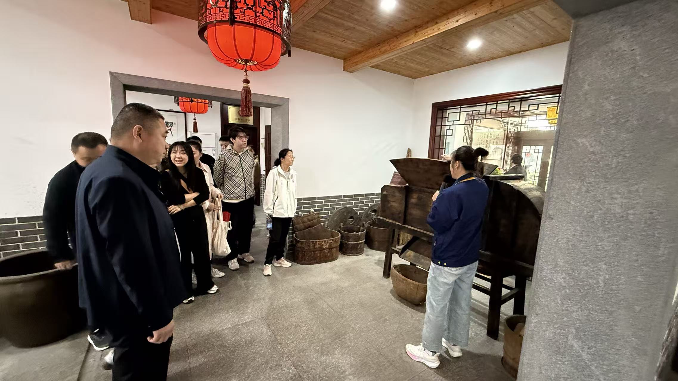 走進(jìn)玉祁酒業(yè),古色古香的釀酒作坊與現(xiàn)代化生產(chǎn)車間交相輝映,空氣中彌漫著醇厚的酒香。在企業(yè)工作人員的帶領(lǐng)下,黨員們先后參觀了雙套酒釀造技藝展示館、企業(yè)展覽館、釀造車間、江南醬香酒體品鑒中心等場所。從明清時期的釀酒器具、古早的酒標(biāo)標(biāo)識,到如今的非遺釀造技藝展示,一幅幅珍貴的歷史圖景、一個個生動的生產(chǎn)場景,全方位展現(xiàn)了玉祁酒業(yè)百年的傳承與發(fā)展。